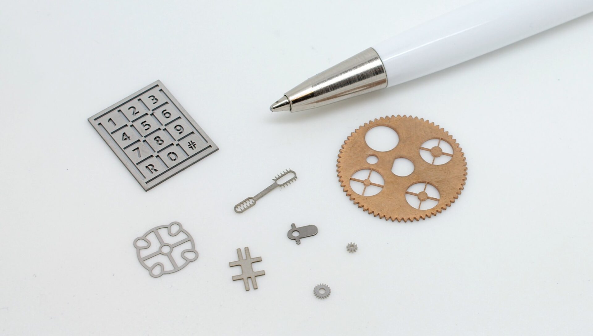 • „Feinschneiden“ in maximalen Abmessungen von 400 x 400 mm und von 0,01 bis 1,5 mm Dicke. Konturgenauigkeit bis +/-0,005 mm möglich.